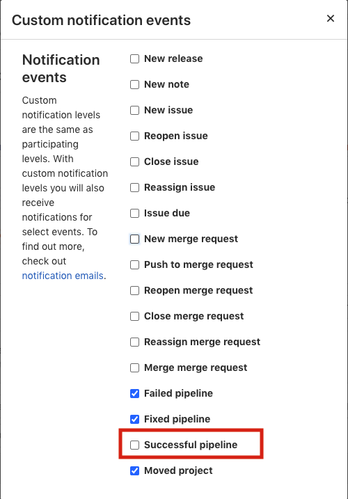 To be notified about pipeline successes as well as failures, click the box under "Global notification level" and select "Custom"