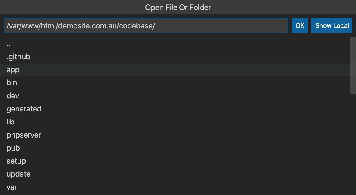 Browse to your webroot. This will normally be in the form of /var/www/html/<site-name>/codebase/ and click OK. You can click on subdirectories below instead of typing the whole path by hand.